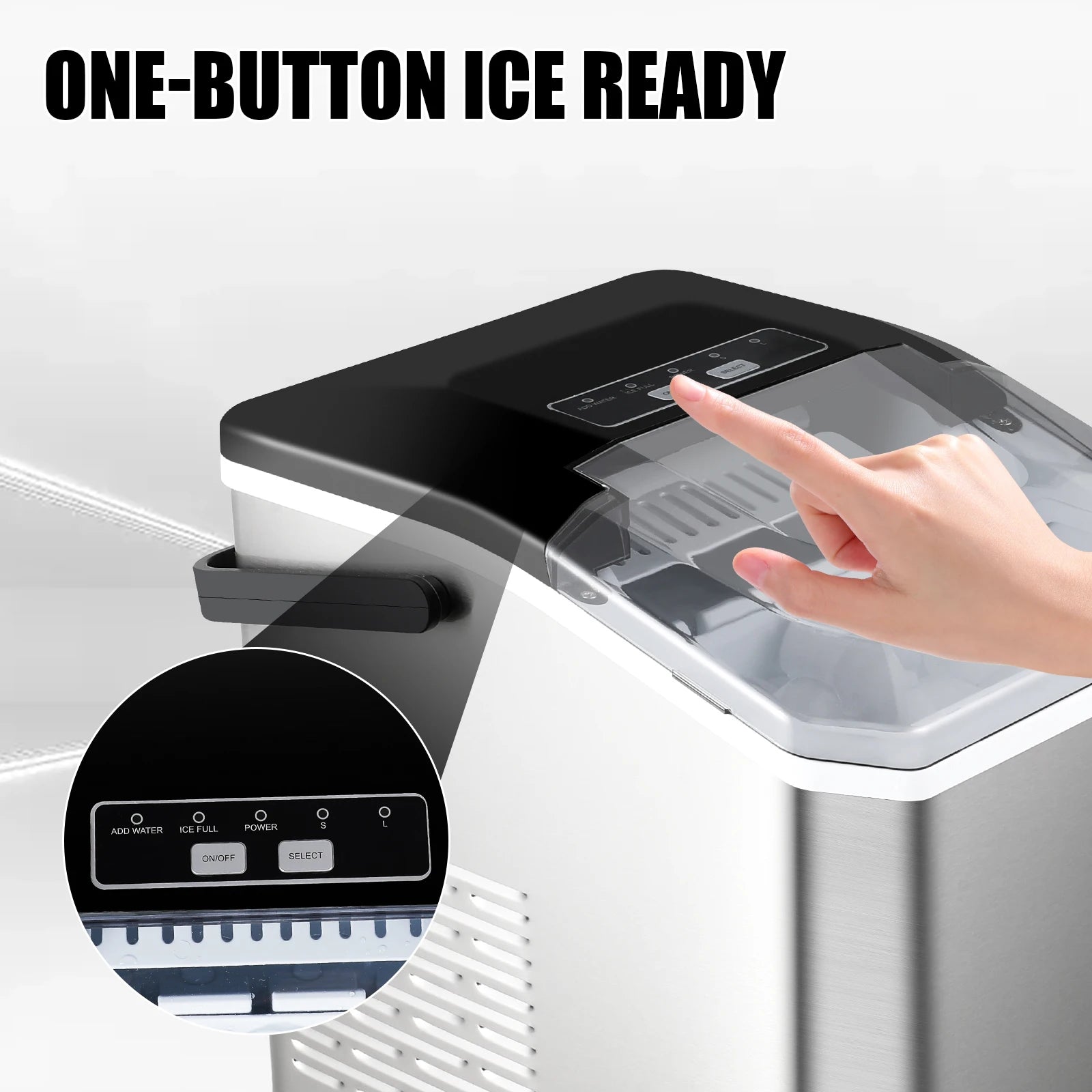 Aparatul de făcut gheață 110W produce până la 12 KG de gheață în 24 de ore, are funcție de curățare automată, face 9 cuburi la fiecare 6–8 minute și oferă două dimensiuni de cuburi. Silențios (40 dB), elegant și perfect pentru casă, office sau petreceri.